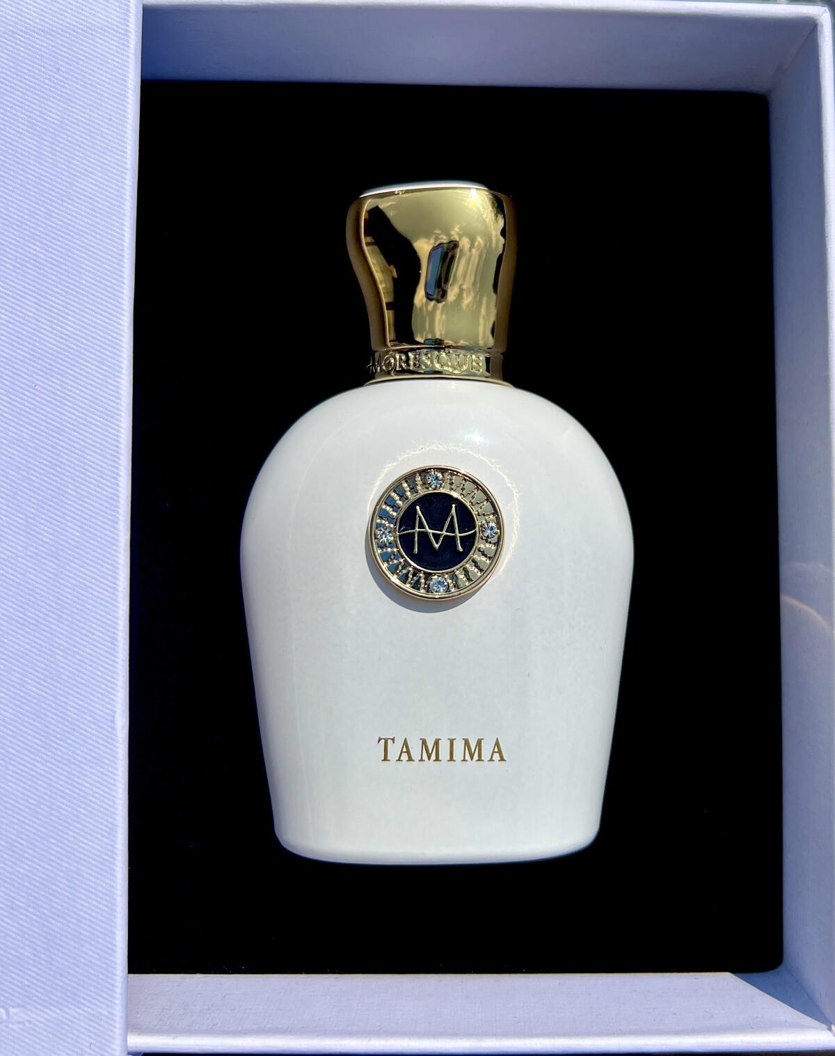 “Tamima is an olfactory allegory to the princess and poet Tamima, wife of the Almoravid sultan Ali ibn Yusuf of Morocco. The floral-woody perfume is an inspiring mélange created around the modern notes of cashmeran, which allude to audacity and spark. Open-mindedness and remarkableness are suggested by the notes of neroli and orange that merge confidently into an altruistic heart of eucalyptus and amber. The rich woody base, sweetened by bourbon vanilla, provides a sense of confidence and accomplishment” — press release of the brand.